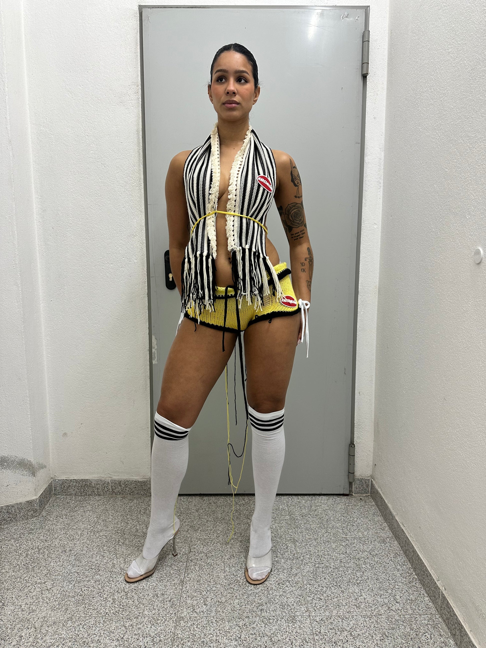 Each piece is unique and made from scratch, one yarn at a time and loose stitches placement and color may vary slightly from the set in the picture. You can cut or keep the loose strands for your desired taste.